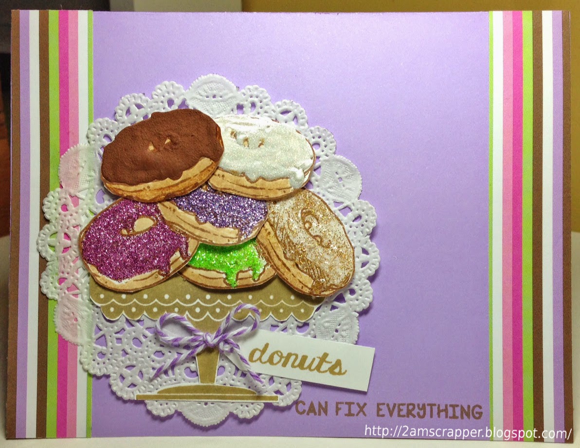 Donuts are stamped with Archival ink in Coffee. (Don't use water soluble ink--it will make the frosting bleed.)